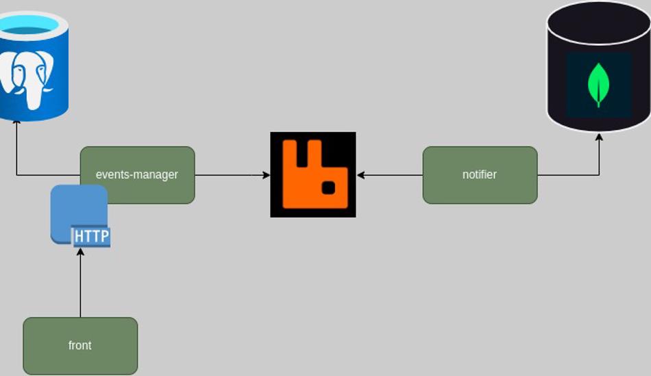 Events Manager publishes events to the Notifier using a message broker (In this case RabbitMQ).